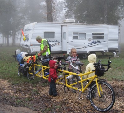 When we pull into the park we are in for a surprise. Pam, the campground manager, has arranged for us to stay in a travel trailer. What a luxury. The trailer has a double bed, a set of bunk beds, a pull out bed, a table, a kitchen and a bathroom with shower.