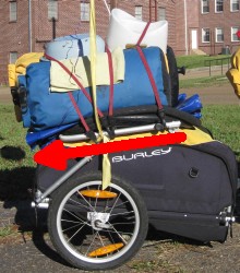 Loading the bicycle on the trailer. Securing it with many bungy cords.