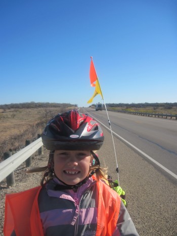 The terrain is hilly. Up the hill we warm up well, down the hill it gets cold, because of our speed. We dressed the girls for 50s weather, but down the hill they get chilled. We stop to add extra layers. It is time to update our wardrobe. Sooner then we anticipated.