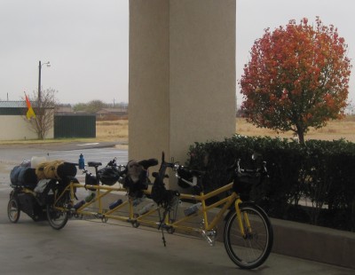 We are in Slaton now. This concludes the fourth leg of our journey, with a total of 2,885 miles. We are going to stay here until we've got the bicycle all retooled and the new Burley trailer put together. Winter weather is forecasted for the entire week. If it moves out on Saturday, that will be the day for us to start the fifth leg of the journey, from Slaton, Texas to San Diego, California.