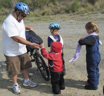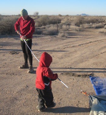 Posing at our campsite at Rancho Sonora with officer Hansen. He was told of our bicycle by his fellow officer.