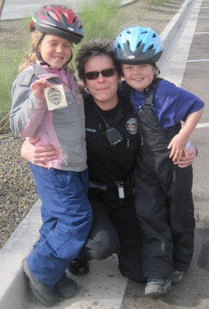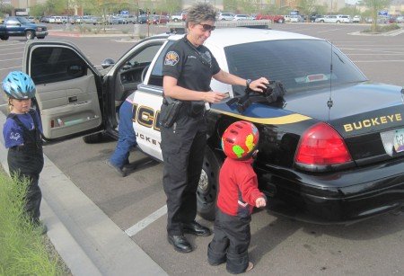 Officer Kelly 'pulls us over' in Buckeye. The girls are all over the car and are testing all the buttons. Each gets a stack of stickers of the Buckeye police force.