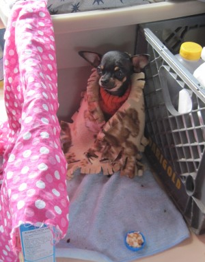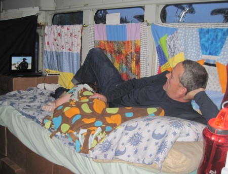 Enjoying some quiet time. It's a rainy day, so no roof work today. It gives Bill the time to work some more on Old Blue. There is always a new kink to work out.