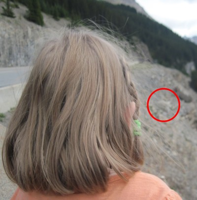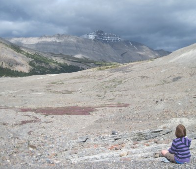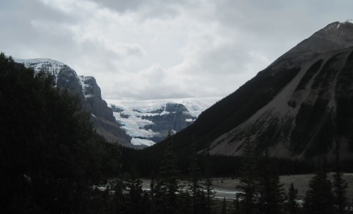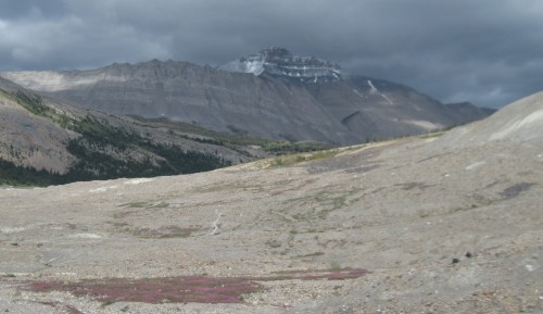 From Mistaya Canyon, Old Blue takes us slowly up to Bow Summit, at an elevation of 6,849 feet. From there, a small hiking trail takes us to the turquoise blue Peyto Lake. At a description sign, it tells us that the light reflects the blue and green colors off of rock particles (rock flour), giving the lake its color.