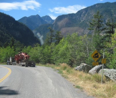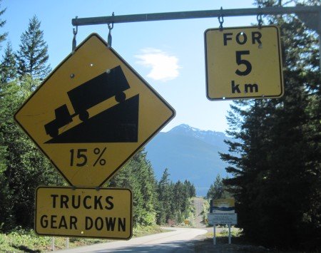 As the steep mountains are now behind us, we expect the coastal range to be at least as challenging. This turns out not to be true. The roads are wide, the inclines and downhills not so bad (especially considering we just came down a 15% one), before we know it we're past Whistler.