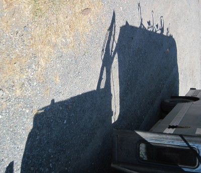 The canyon through which the Frazer river flows is visible through Yeller's spokes.