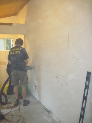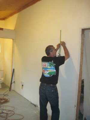 Michelle observes our handy work (our = Bill, Paul, Michelle and myself; we worked on the project together while the girls were at yoga camp). The wall with the pass through is structurally improved, the window-to-door opening is ready for the door.