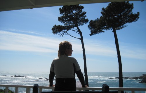 Amarins is enjoying the sights from the balcony of our room at the Little River Inn.