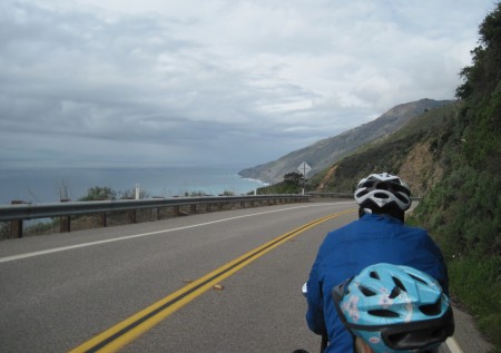 It's extremely windy here at Julia Pfeiffer. We go a little further to find a spot to take a break. We pass a blind curve. We can't see what's behind, and we can't see what's ahead. These are intense moments. We're very thankful for the wide shoulder at this location.