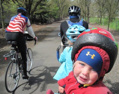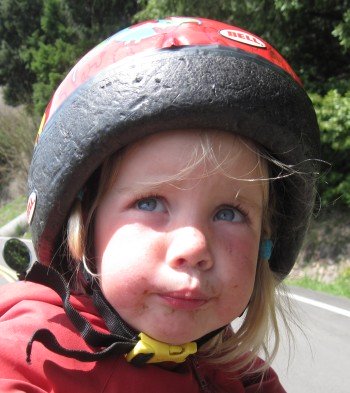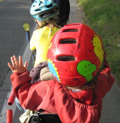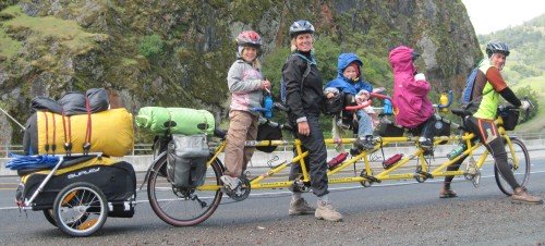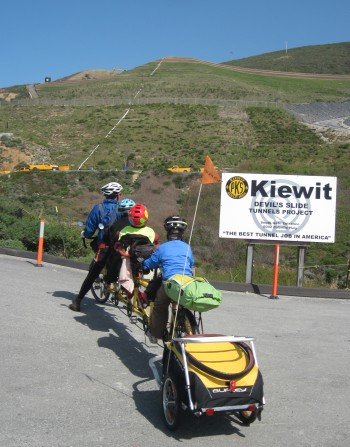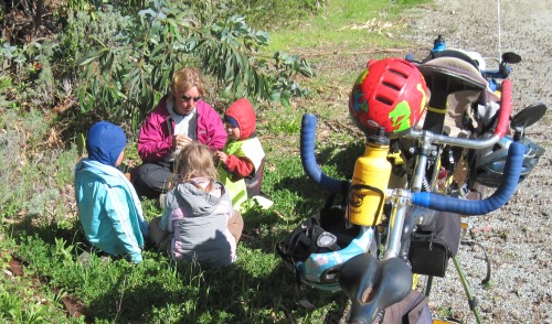 Amarins takes Robin and Mae for a ride to the front of the campground. We're on a quest for laundry detergent. As well as on the lookout for the daddies. It's been quite a while and they have not arrived yet. After a succesful quest, Amarins decides to check up the road a bit to see if the daddies can be located. After several miles we spot the big yellow bike at the crest of the hill. The men are taking a highly deserved break. The little girls jump into their arms.