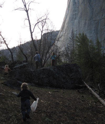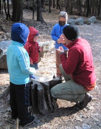 It's wet and damp, but dry from the sky. The kids pick up playing where they left off; coloring, skateboarding, enjoying the campfire. The bacon is sizzling on the grill, another billy is boiling. Breakfast is going, the bags are being packed up.