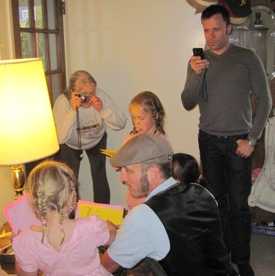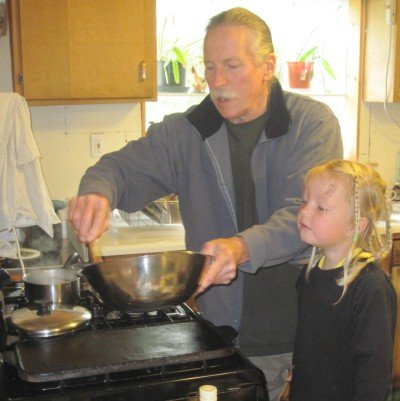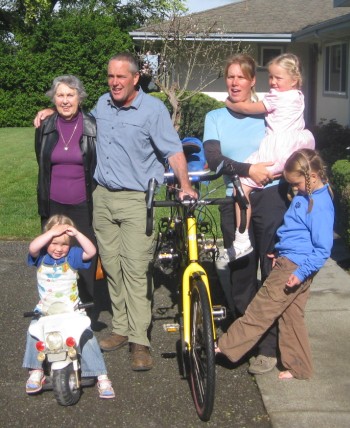 We load the bike before we enter the house. We're having pancakes for breakfast. The girls are right at home. Dog Patch is quite a hit when she does some tricks for Kosta.