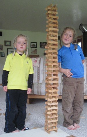 Cheyenne is building a tower. Jasmine tells her which way the tower is leaning.