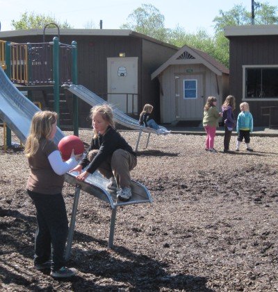 The rest stop is at the perfect halfway point to Leggett. The girls climb the fence and enjoy the sun on their bodies.