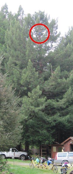 Perfect timing. As we get ready to get back on, Kevin arrives. He's going to finish today with Bill. Amarins and the girls head for the park. The road to the park is very trying. It goes down a little, but then has a several miles long, incredibly steep climb, before cresting. When you get to the other side of the hill, the road goes down into a valley full of huge redwoods. A magnificent scenery. Totally unexpected. The campground is another mile through the woods.