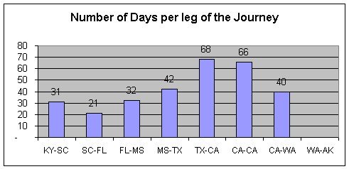 A bar chart is also useful to show how many miles per leg we've traveled, as well as how many nights we stay in each state.