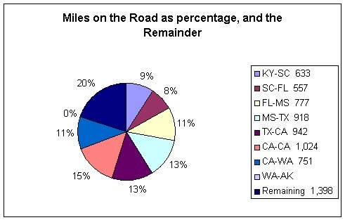The Journey in Charts and GraphsThe Total PictureWith seven legs of the journey finished, we have gathered a great amount of information. This information is wonderfully displayed in graphs. Using pie charts you see how many miles we have pedalled per leg of the journey, as well as the remaining number of miles still ahead of us. It is also displayed in percentages.