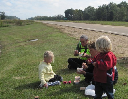 After talking with the local press and a stop at the Piggly Wiggly, we are on our way. It is going to be a short day. We have the sun and the wind in our backs.
