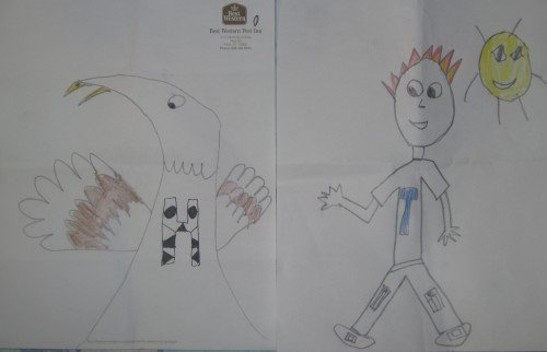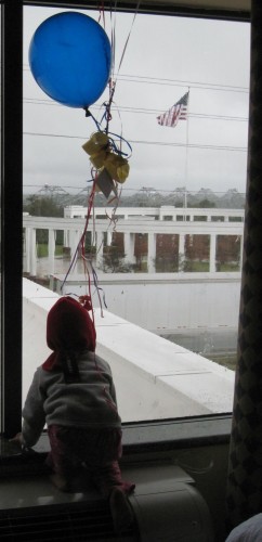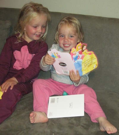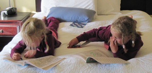 Our room is terrific. It is huge. Lots of room for the girls to run and play. The window lets us look out at the bridge and the river. The girls immediately get changed into their new outfits and start coloring in their new coloring books.