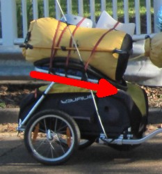 Loading the bicycle on the trailer. Securing it with many bungy cords.