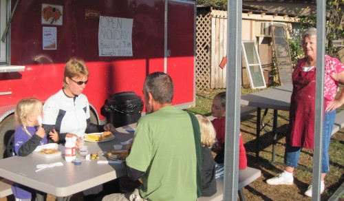 When Greg gets back from Anson, he reports it is another 16.5 miles. We're glad we stopped. We have a chicken, sausage, barbeque and macaroni salad. It tastes so good. And it is warm too. Thanks Greg! We've finished supper as the reporter arrives. She brought innertubes! Now we don't have to worry about that anymore. Thank you so much!