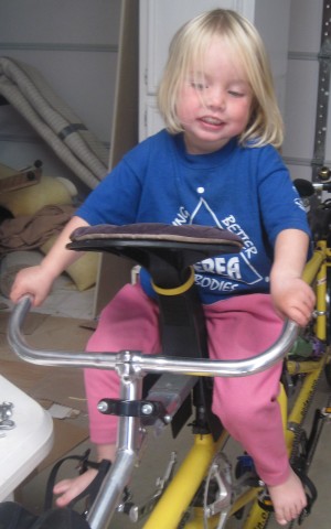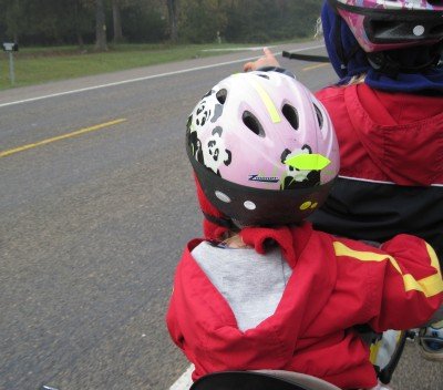 The terrain is hilly. Up the hill we warm up well, down the hill it gets cold, because of our speed. We dressed the girls for 50s weather, but down the hill they get chilled. We stop to add extra layers. It is time to update our wardrobe. Sooner then we anticipated.
