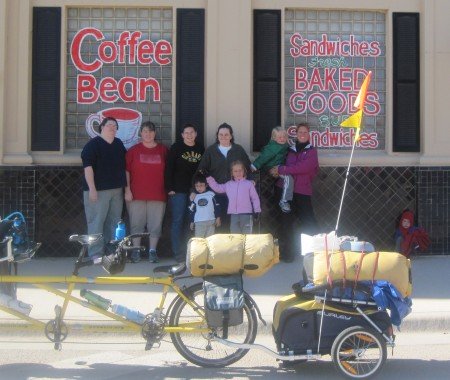 Town is just up ahead. We can see the tall courthouse above all else. We already decided on a motel today. But first we are looking for a place to have lunch. We ride around the courthouse and find a sandwich shop on the corner. One of the employees saw us riding a little while ago and traced us down just as we pulled to a stop. They are inviting us for lunch. Great!
