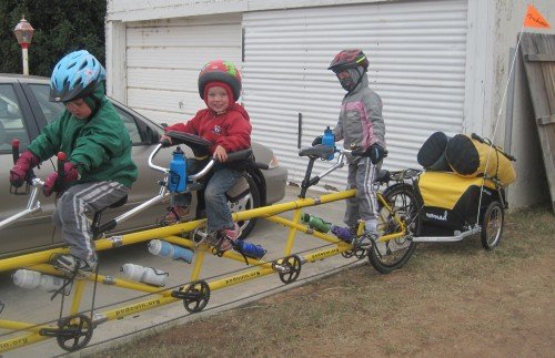 We wrap the kids up warm before letting them go outside the tent. Then for us it is time to pack up once more. When all is put away and one way or another connected to the bicycle, it is time for breakfast. We have chocolate milk left from yesterday. It stayed nice and cool last night. Raisin bread and fruit will do.