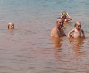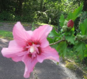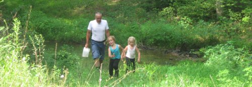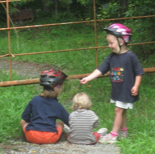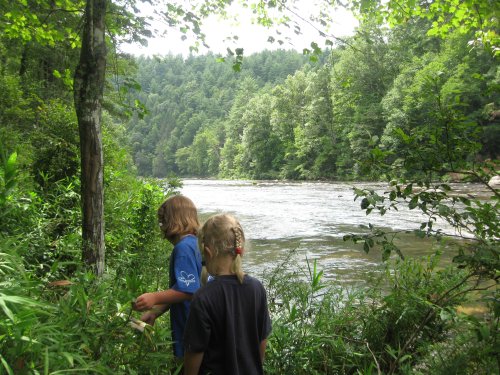 The girls are having a great time exploring. They see a big fat river rat in the bushes. They find different flowers and reeds. They are out in nature having a great time.