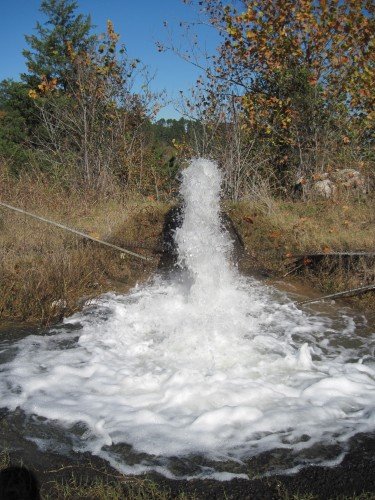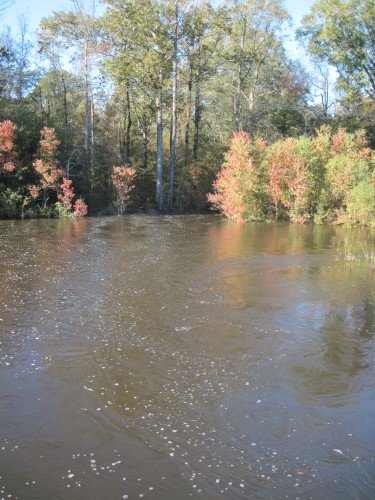 A flooded area. The water is receding, causing a current and whirlpools to appear.
