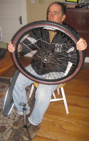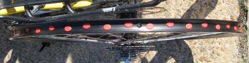 The flat tire provides us with a closer look of the rim. The orange knobs are protectors for the spokes, or actually for the inner tube. The spokes cannot penetrate the innertube because of these protectors.