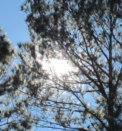 The sun shines so nicely through the trees. The forests are full of coniferous trees.