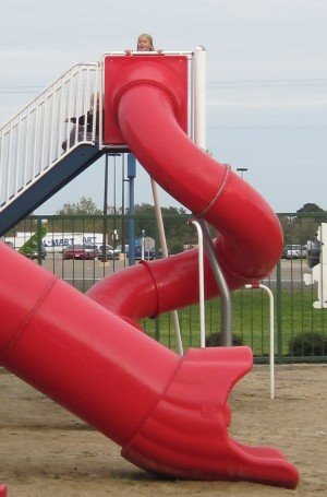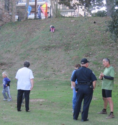 As Bill is talking with the Chief of Police, Robin decides that the bank is a great 'natural' slide. Hmmm, pink pants plus dirt equals very filthy clothing.
