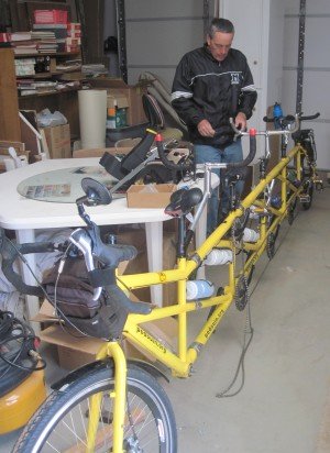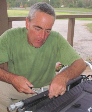 Bill is putting the bolts back in the trailer, after adding a steel rod and drilling new holes.