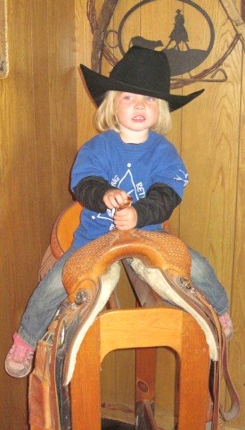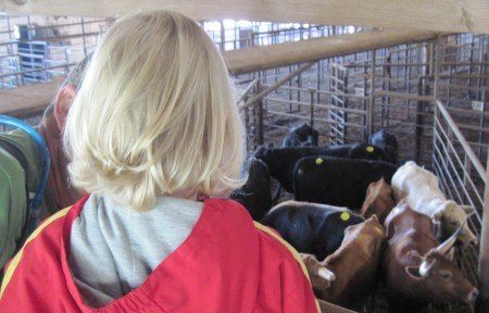 Bill is keeping a close eye on Robin. Robin is very intrigued with all the cows.