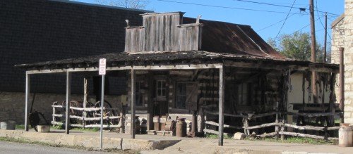 The old blacksmith shop looks tiny compared to the newer buildings.