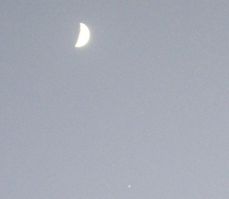 The moon is up. The first star is visible. It is almost time for star gazing. Cheyenne can tell by looking at the moon whether it is going to be a full moon or a new moon. This moon tells her it is going to be a full moon next week.