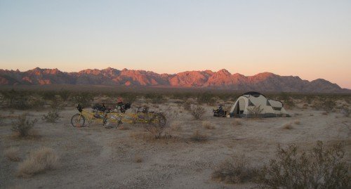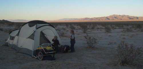 Our desert camp at the foot of the Coxcombs mountains in Cadiz valley. We don't put the fly on so we can look at the stars tonight.