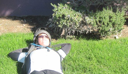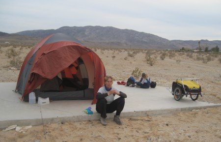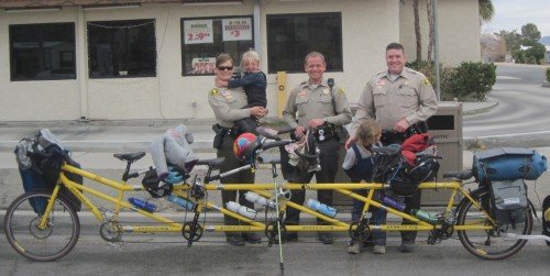 Posing at our campsite at Rancho Sonora with officer Hansen. He was told of our bicycle by his fellow officer.