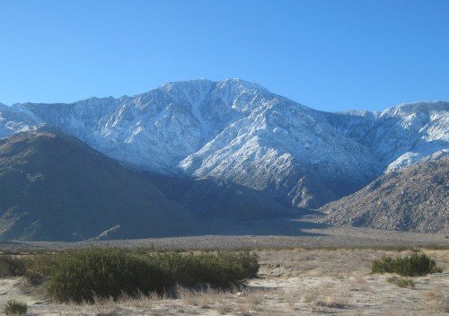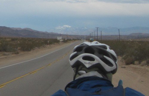 We're getting closer and closer to the snowcapped mountain. It's hard to estimate how far away it still is. We reckon Yucca Valley is on this side of it.