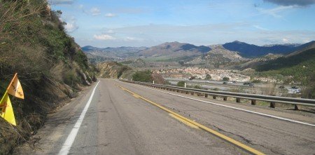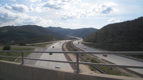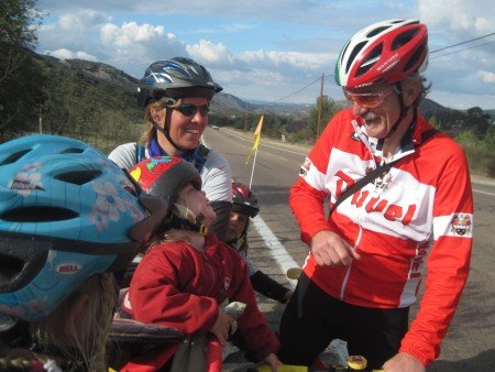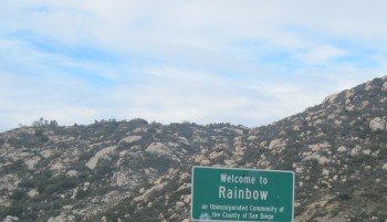 January 27, 2010 San Diego county line. We can almost smell the Pacific Ocean. The town of Rainbow. We came from across the valley. Still climbing. And up some more. This was a one hour hill with a gorgeous view over the valley we just came through. While Bill helps fix the car, the girls have time for make-up. Crossing interstate 15 once more. It's still a windy way to Escondido. Goofing off with Mr Mandaric.
