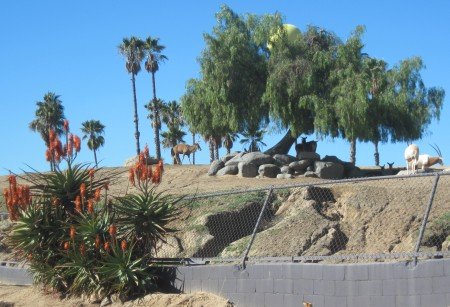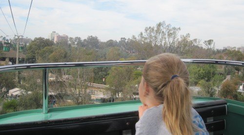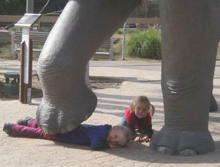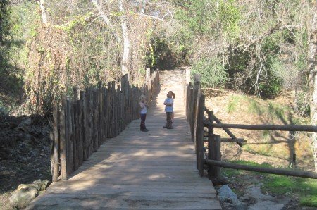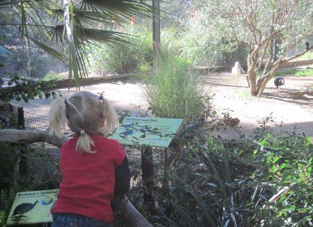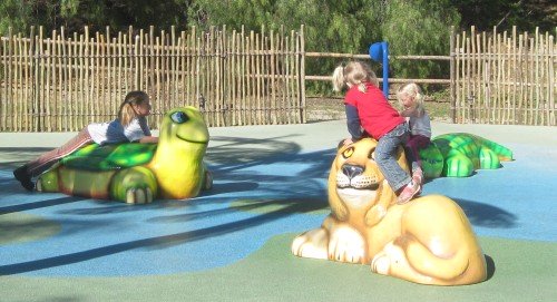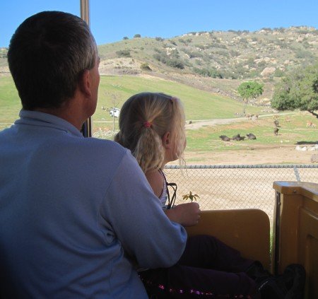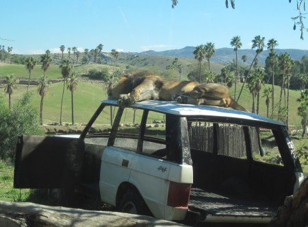 January 28, 2010 Bird watching.  Animal of the day. Riding together. Observing the wild animals from the tram. Pretty layout. Just 'lion' around. Robin has fallen in love with the lion. We're taking the secret short cut over the suspension bridge.