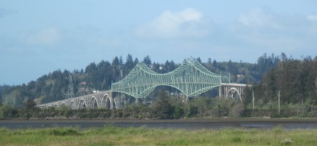 Arriving at the bridge north of Bandon. About 10 miles went missing between the beginning of Bandon and the bridge. We arrived in town with milemarker 272 and left at 261. The town is really not that big!