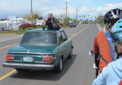 Bill compares the size of our bicycle to the size of the Lincoln.