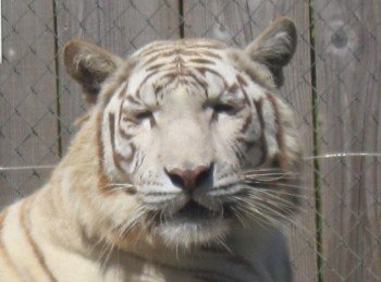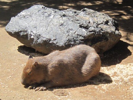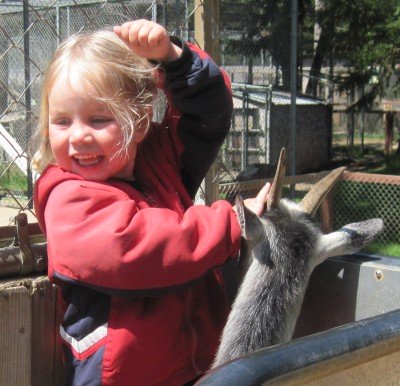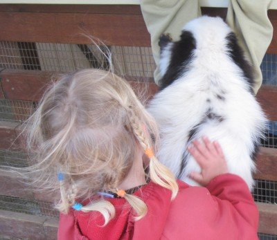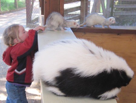 Robin is trying to climb high enough so she can pet Slippers and Flippers. Skunk Daisy is in the foreground.