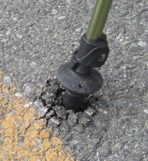 It's so warm today, that the pressure of the bicycle on the walking stick makes an impression in the asphalt.