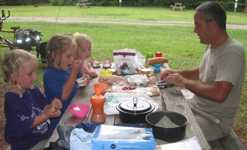 One of the fellow campers offers Amarins a ride to the store. Two gallons of water, potato wedges, hotdogs, eggs, dried and fresh fruit, as well as a chocolate bar and chocolate cookies are it for tonight. After finishing a quick lunch we all are taking a nap. Cheyenne says she isn't tired, but she eventually falls asleep as well.