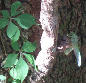 Bill and the girls are roaming the woods when they stumble upon a discovery. A cicada just molted and was still sitting on its shell. Click here for a neat movie of a cicada shedding its skin.