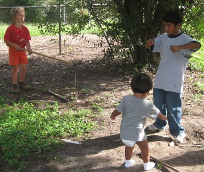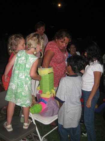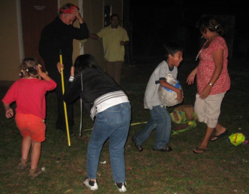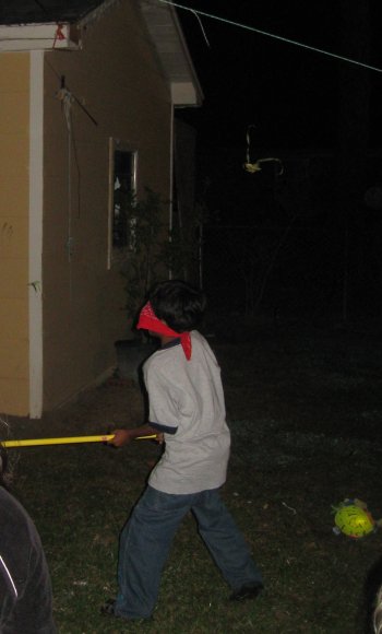 The kids are all checking to see if Miriam is putting enough candy in the piñata. With their approval, it is time to hang it up and see who can beat it to pieces. Everyone gets a turn until it is broken. Omar gets a first shot, since it is his birthday. He immediately hits an 'arm' off.