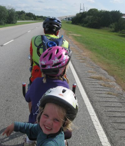 Mile after mile we enjoy the scenery, the spanish moss, the butterflies and the lilies. We ride through small communities, we see the smallest church of America, we are followed by a three legged dog. We snack and we pedal, we roll and we stop. We are alive. We are together as a family on an unforgetable journey.